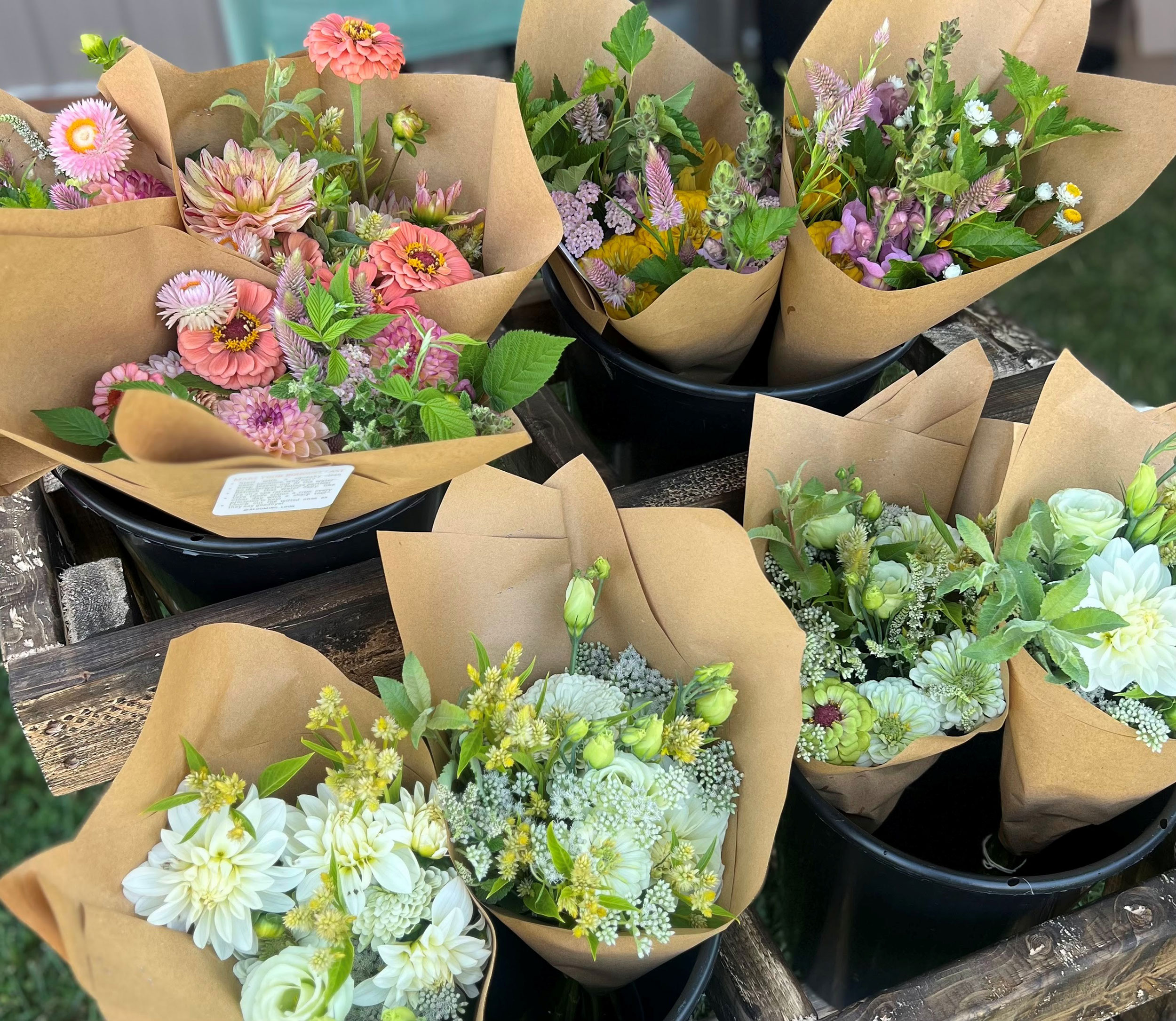 A DIY flower bucket is perfect for anyone who loves the beauty of fresh, locally grown flowers but wants the freedom to play and create their own arrangements. Each bucket contains approximately 60-75 stems. The bucket is “farmers choice” which means it includes the best of what is currently blooming at the farm or other local farms, and is a mix of focal flowers, fillers, and foliage, freshly harvested and ready for arranging!